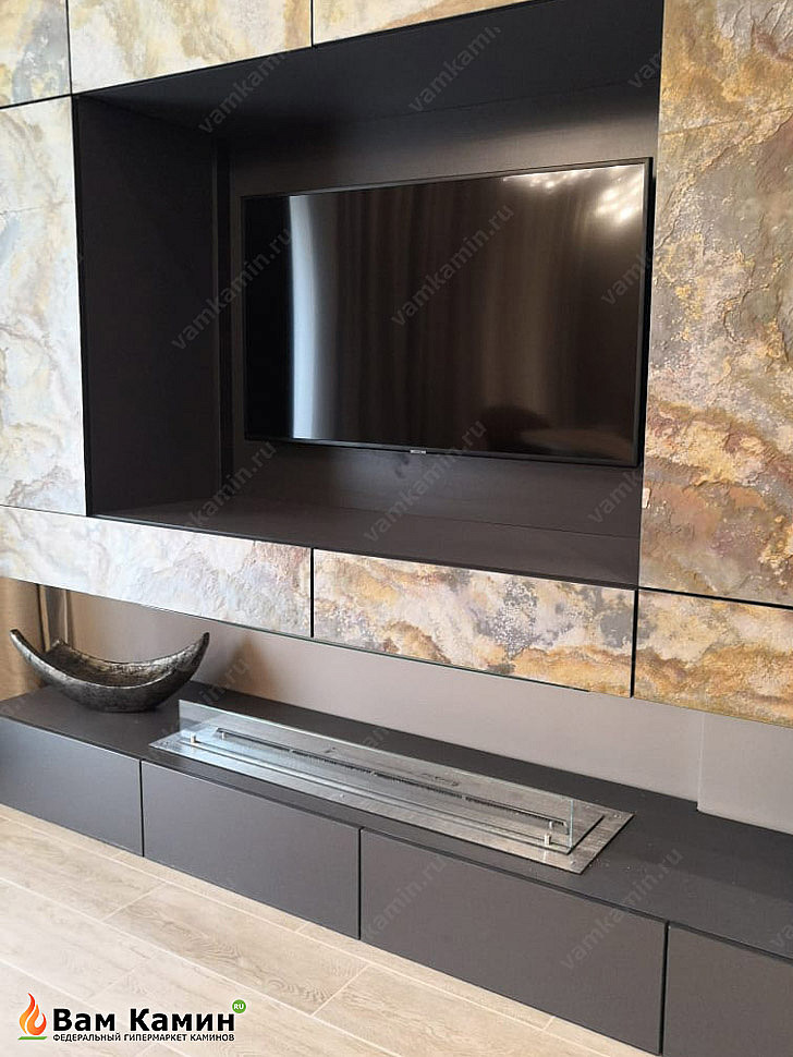 Видно, что хозяева креативно подошли к отделке интерьера. Топливный блок SteelHeat LINE GLASS 1000 интегрирован в тумбу, которая расположена под TV нишей. Стильная ТВ ниша, мраморная облицовка и новый топливный блок с защитным закаленным стеклом в серой тумбе образуют изящное дизайнерское решение. Линия огня в такой топливной горелке достигает 900 мм. Тепла такого топливного бака хватит на то, чтобы обогреть все помещение.